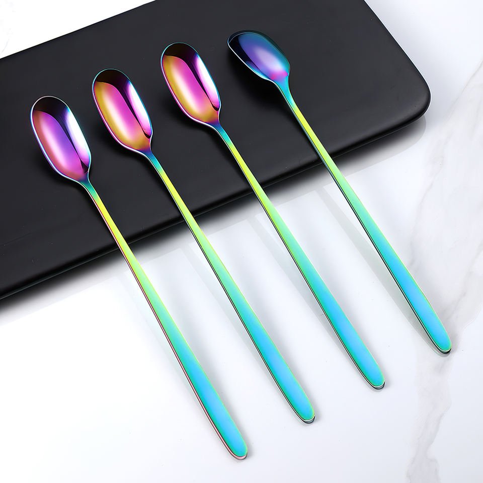 Disponible en una variedad de colores deslumbrantes, incluyendo tornasol, plateado, negro y dorado, nuestro juego de cucharas mezcladoras añade un toque de sofisticación y modernidad a tu barra de coctelería o a tus preparaciones en la cocina. El acabado brillante metalizado brinda un aspecto lujoso y atractivo, haciendo que cada cuchara sea un verdadero deleite para la vista.