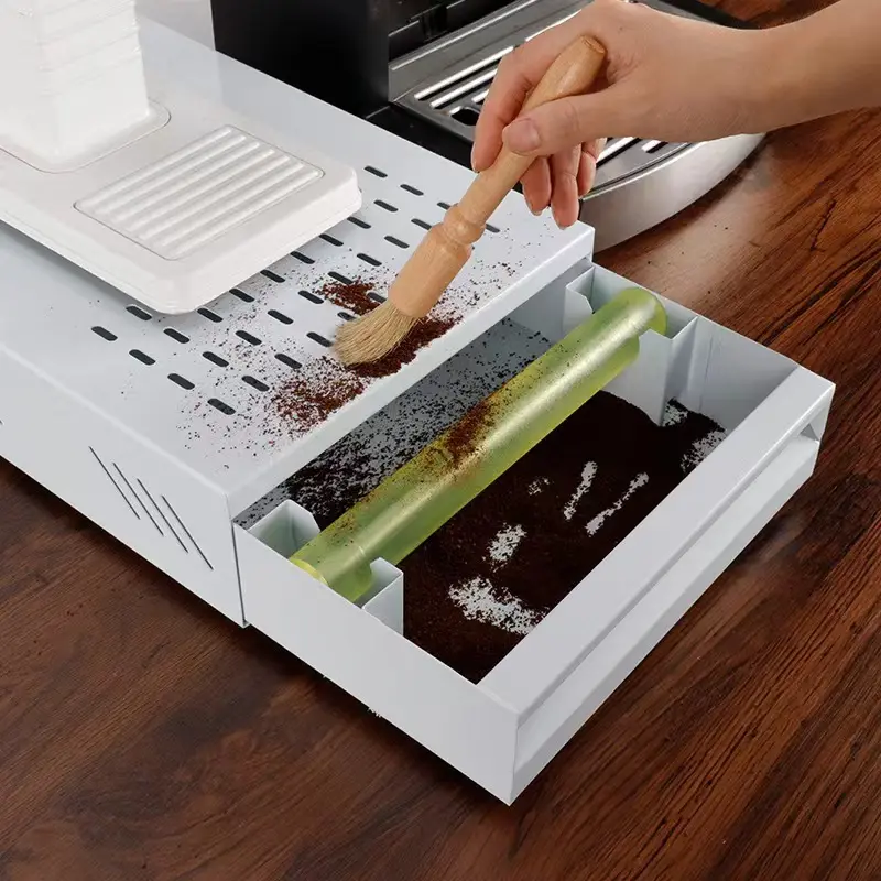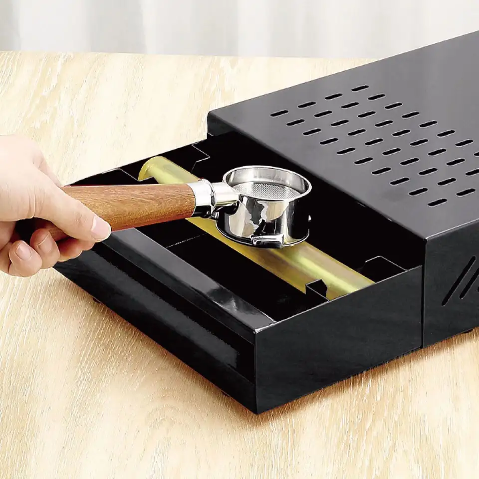 Utilizar nuestro Knock Box es sumamente sencillo. Simplemente coloca el portafiltro sobre la base y golpéalo suavemente para liberar los posos de café. Los posos caerán directamente en el cajón, listos para su posterior desecho sin complicaciones. Con esta solución práctica y eficiente, los baristas pueden optimizar su tiempo y mantener un entorno de trabajo organizado y limpio.